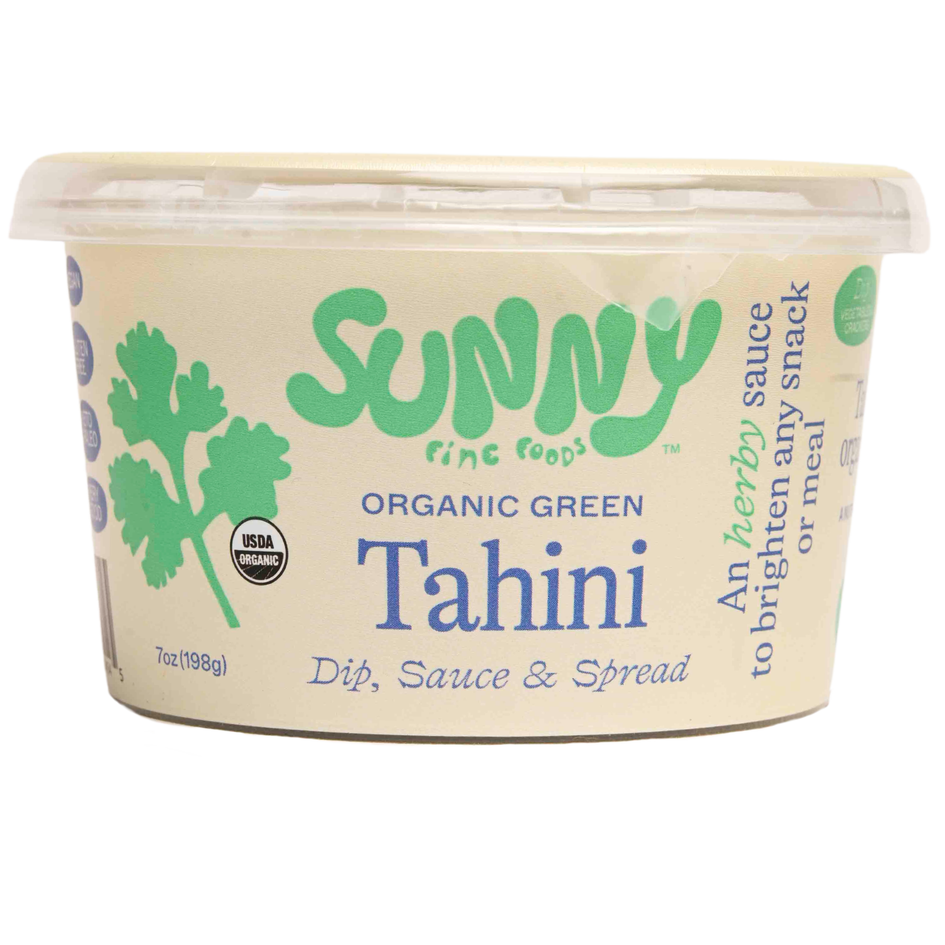 Creamy organic tahini whipped with organic cilantro, basil, and a tiny bit of jalapeño for a fresh and herby bite.